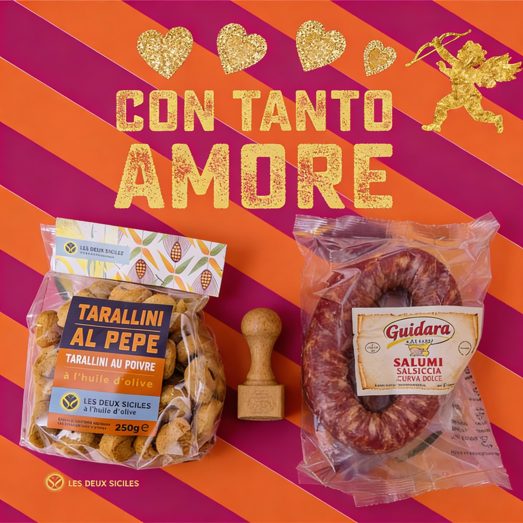 L’association des taralli siciliens au poivre, croustillants et parfumés, et du salame rond, généreux et savoureux, crée un duo de caractère, parfait pour un moment complice à deux.